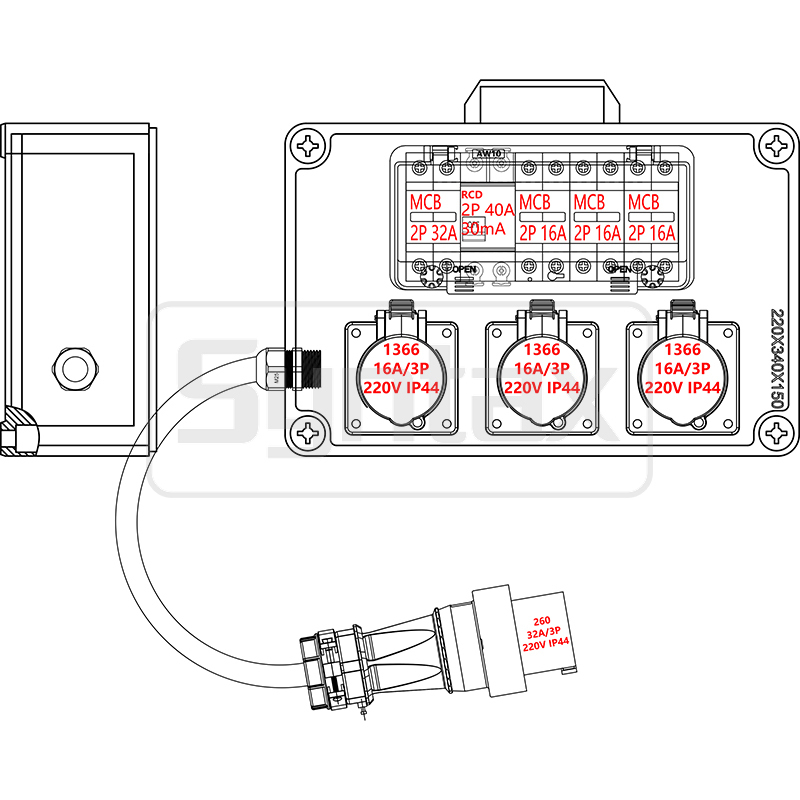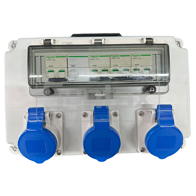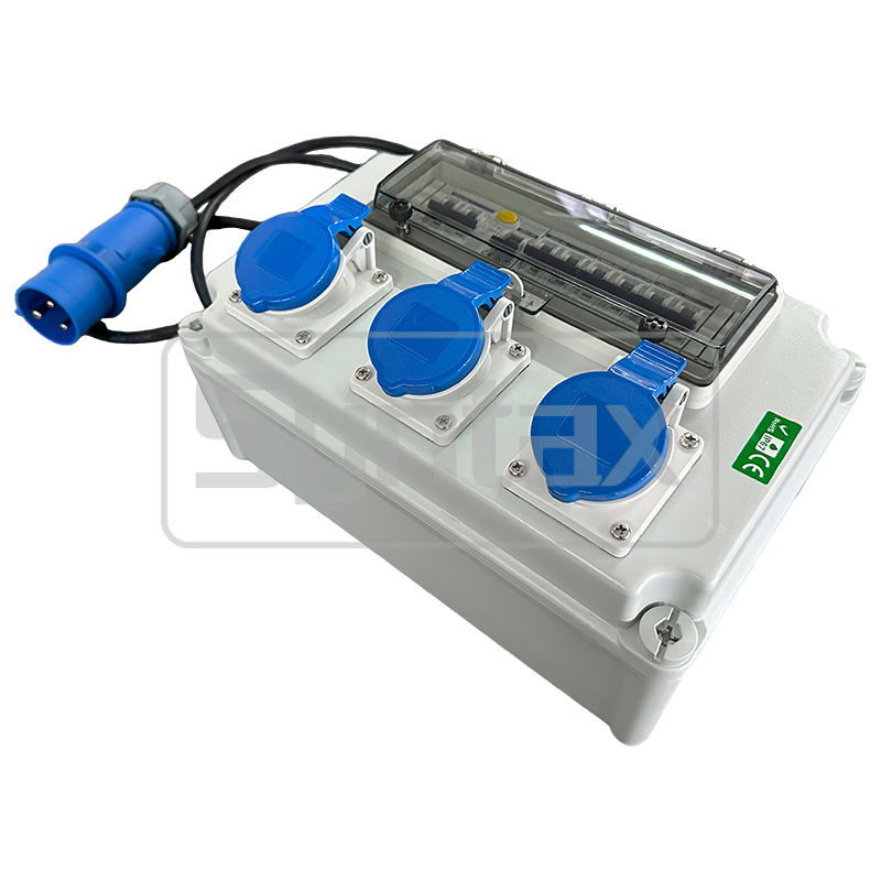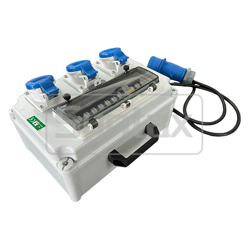 Papan distribusi yang dipasang di dinding fase tunggal 32 AMP untuk penggunaan di luar ruangan dibuat dari bahan PC, ia memiliki kabel ekstensi 3C4mm2 1.5m dengan Steker 3P 32A 220v, dilindungi oleh MCB+RCCB. Soket keluar adalah soket tipe lurus yang dipasang di panel 3P 16A 220v IP44, yang dilindungi oleh 3 buah MCB 2P 16A. Semua papan distro daya dibuat sesuai pesanan.