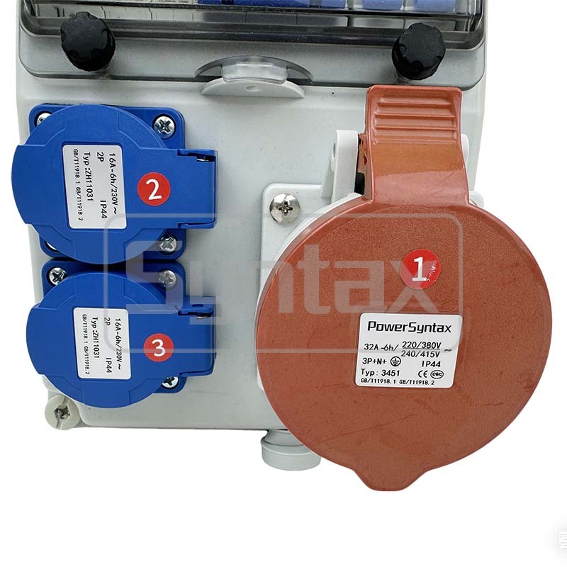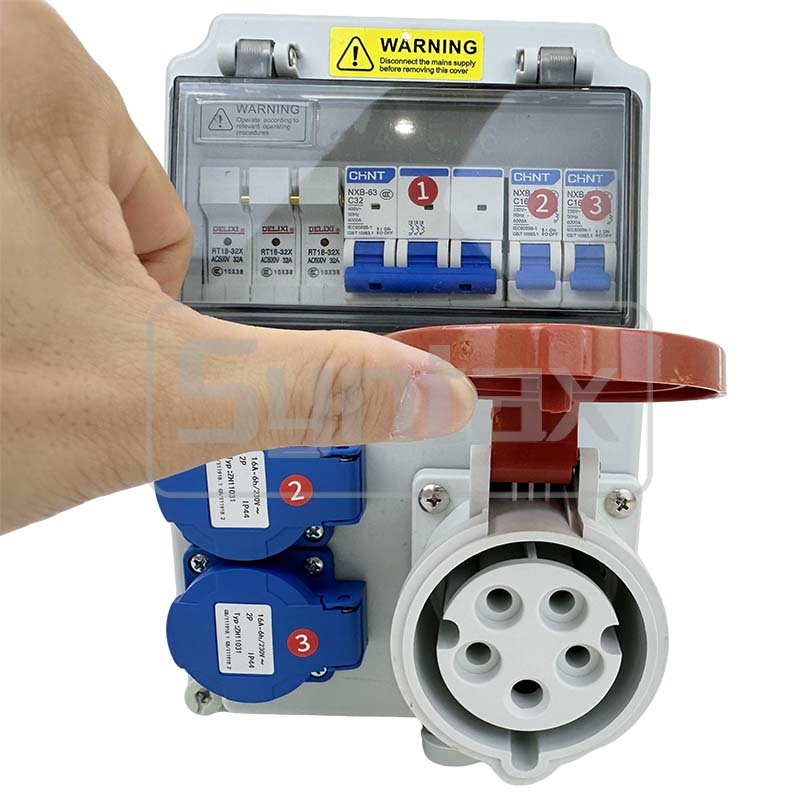 Kotak distro dinding tiga fase 32 AMP dibuat dari bahan PC dalam tipe yang dipasang di dinding, tidak ada steker masuk dari kotak, Sekring 3x32A untuk sambungan kabel masuk. Soket keluar adalah 1 nos soket 32A/5P 400V IP44, dilindungi oleh 1 nos 3P 32A MCB, dan 2 nos 16A/2P+E 220v IP44 Schuko Sockets, dilindungi oleh 2 nos 1P 16A MCB. Semua papan distro daya dibuat sesuai pesanan.