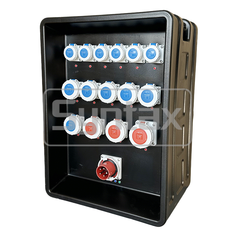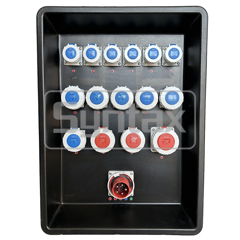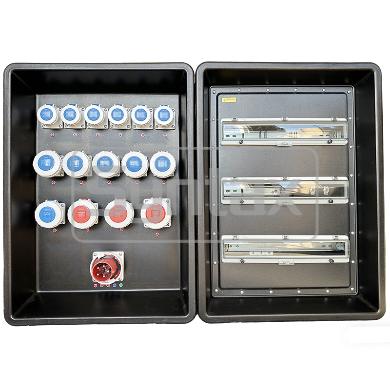 | Keluar 13-14 | 2×Soket Terpasang Panel 5P 32A 400V IP67, dilindungi oleh 2×4P 32A MCB + 2×Relai Kebocoran Arus Tanah, dengan sakelar toggle |